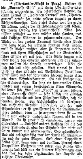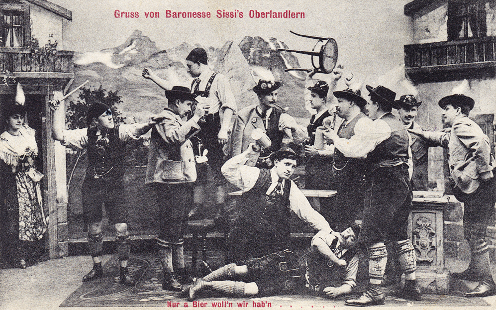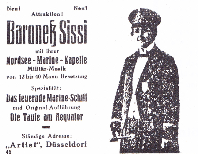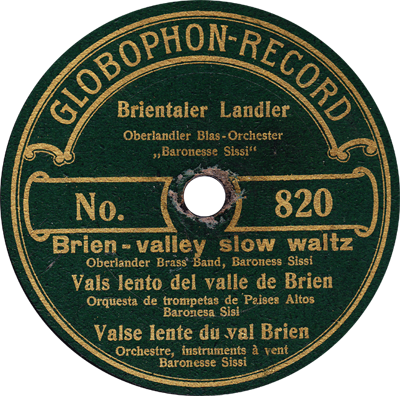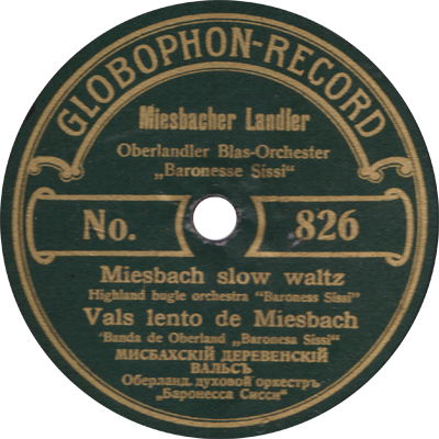 Was ich vom „Oberlandler Blasorchester – Baronesse Sissi“ weiß (oder vermute!?). Vorab – der lokale Namensteil der Gruppe dürfte sich auf das bayrische Oberland (zw. Garmisch und München) beziehen – nicht auf das Tiroler Oberland - obwohl ein Großteil der mir bekannten Aufnahmen Tiroler Titel sind (z. B. Innsbrucker-,Zillertaler-,Brixentaler-Landler). Der Leiter der Kapelle war „Baron RIKL“ – bürgerlich „Nikolaus Kugler“ – halb Bayer, halb Österreicher (geboren im Eisenbahnzug zwischen Wien und München)! Seine Tochter „Baronesse Sissi“ dirigierte die in bayrischer Tracht spielenden Musiker. Sie wird als rundlich-hübsches Frauenzimmer beschrieben, die ab und an auch mit einem „Schuhplattler“ glänzte. Ob es sich bei der „Nordseekapelle Baronesse Sissi“ um ein und dieselbe Formation handelt, weiß ich nicht (glauben tu ich’s aber gleich!). Alle meine Informationen stammen aus der Zeitung (um 1911). Die Platten in meinem Archiv dürften auch aus der Kaiserzeit sein (Nordseekapelle fand ich nichts – nur Oberlandler Blasorchester) - und nach meinem Wissen ausschließlich von der - recht seltenen deutschen Plattenfirma "Globophon" (Exportmarke) aufgenommen worden sein. Vielleicht bekomme ich irgendwann mehr heraus – dann steht das hier: