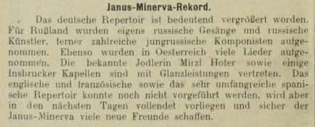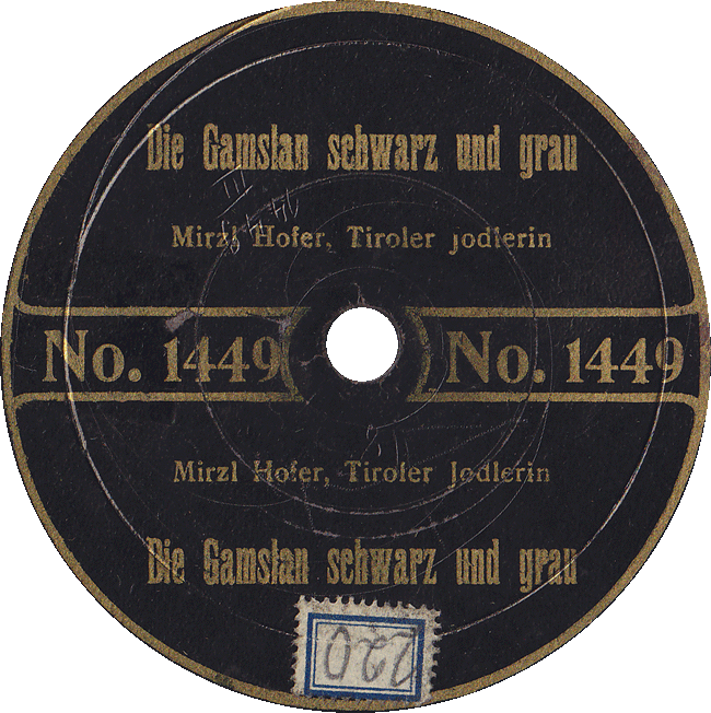 Ich fand kaum Informationen über sie, ihren bürgerlichen Namen entnahm ich einer Zeitungsannonce zum Anlaß ihrer Silberhochzeit am 09. April 1932 – alles Andere habe ich mir - irgendwie „zusammengeklaubt“ (haupts. aus alten Zeitungsberichten). Die Anzahl ihrer Plattenaufnahmen (sie nahm auch auf Edison-Walze auf) ist schon enorm und für damaligen Verhältnisse – zumindest was Volksmusikaufnahmen betrifft - außergewöhnlich (meine Diskografien sind ja selten vollständig – es wird also bestimmt noch einige Aufnahmen mehr von ihr geben!?). Natürlich wurden die Titel mehrfach und von verschiedenen Plattenfirmen aufgenommen – bzw. gepresst, trotzdem kommt da Einiges zusammen. Und die Spannweite reicht u.a. von franz. Pathe-Tiefenschrift-Platten über Gramophone-, Zonophone-, Favorite-, Odeon-Platten bis eben hin zur Edison-Walze (~ 1903).