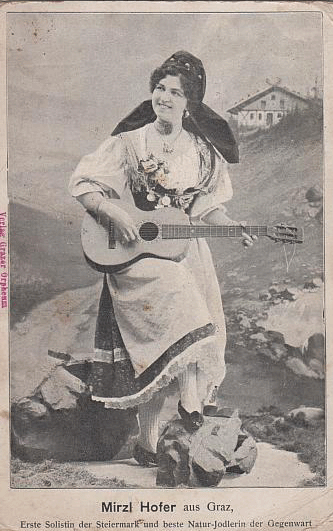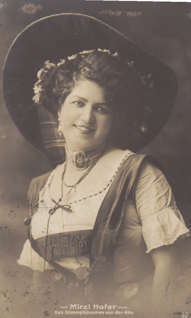 Maria Vidowitsch (verh. Becker) – Künstlername „Mirzl Hofer“ – geboren am 26.05. 1877 in Graz-Karlau, gestorben am 07.12.1955 - ebenda. Um die Jahrhundertwende wechselte sie von Graz nach Wien und wurde dort - binnen kürzester Zeit eine richtige Berühmtheit, die nur in den besten Kreisen verkehrte. Sie wurde (u. A.) als „Erste Solistin der Steiermark und beste Natur-Jodlerin der Gegenwart“ beworben und trat in den vornehmsten Häusern Wiens auf.