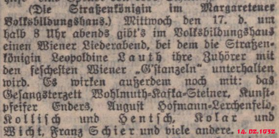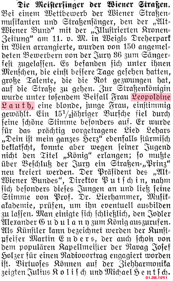 Die Leopoldine Lauth war mir immer nur als Partnerin der Mizzi Starecek aufgefallen (jetzt weiß ich, daß es auch Soloplaten von ihr gibt), dann tauchte aber in irgend einer alten Zeitschrift der Titel „Straßenkönigin“ auf – da wurde ich dann doch neugierig. Ich kann zwar hier keine Biographie von der Lauth anbieten - aber einige, interessanten Sachen fand ich doch!