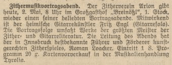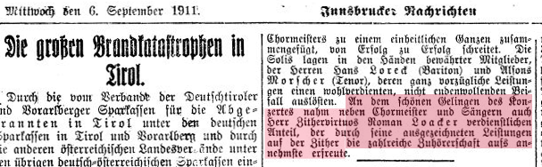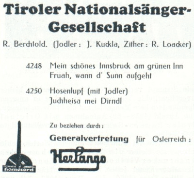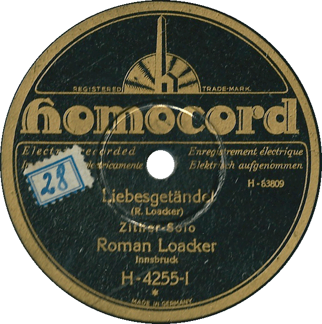 Die ersten Hinweise auf Roman Loacker fand ich bereits um 1911 – zu der Zeit meist als Begleitmusiker diverser Sängergruppen. Die Plattenaufnahmen stammen aus den frühen Dreißiger-Jahren – aufgenommen auf Gloria, Homocord und Columbia . Sicher mit Robert Berchtold‘s – vermutlich aber auch mit Franz Mayr’s Tiroler Nationalsängergruppe arbeitete Loacker Ende der Zwanziger- Anfang der Dreißiger-Jahre eng zusammen (ob der Name nun mit „ck“ oder ohne geschrieben wird, konnte ich nicht herausfinden). Loacker war zu dieser Zeit – neben Roman Ammareller (dürfte ein Schüler Loacker's gewesen sein) wohl der herausragende Zitherspieler in Innsbruck, die beiden haben auch als Zitherduo – zumindest eine Platte gemeinsam aufgenommen. Es tauchen einige Kompositionen von R. Loacker auf, auch wurden seine Platten häufig im Radio gespielt, was doch auf eine gewisse Beliebtheit hinweist. Ansonsten weiß ich leider nichts mehr von ihm!
