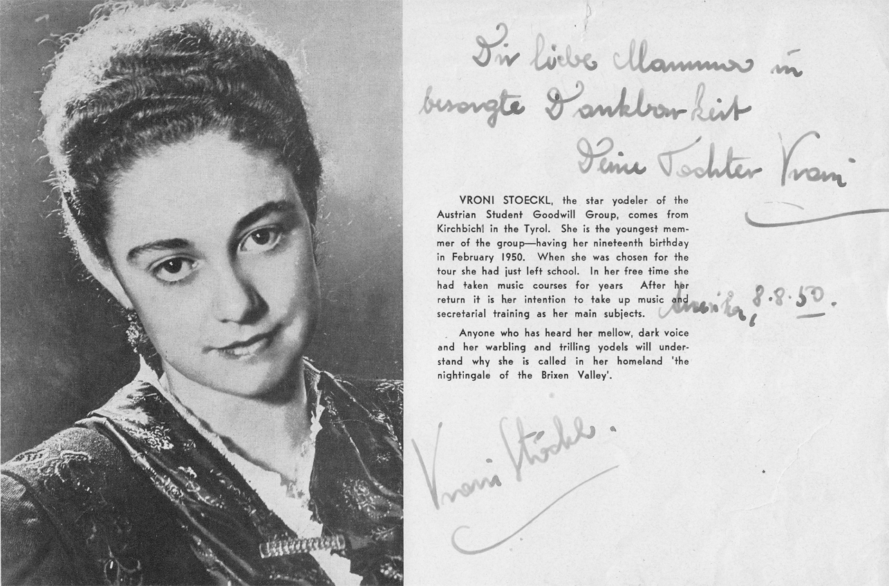 Zurück in der Heimat absolvierte sie noch bis ~1965 diverse Konzerte und Tourneen - danach hat sie geheiratet und ihre Karriere beendet. Vielen, vielen Dank an die Töchter von Vroni – möge sie nie vergessen werden!!