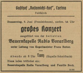 Allzuviel kann ich nicht berichten über diese - für mich "hervorragende" Bauernkapelle aus Vorarlberg. Also - ich denke, daß es hier um eine Studioformation - (vermutlich spez. für den ORF-Radio-Vorarlberg?) rund um "den" Franz Reiter (falls es wirklich "der" Franz Reiter ist?) geht. Der war im Militärmusikbereich sicher eine Größe in den 50iger-Jahren - hier eine kleine Biografie: