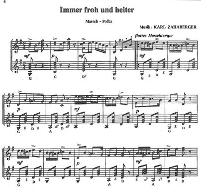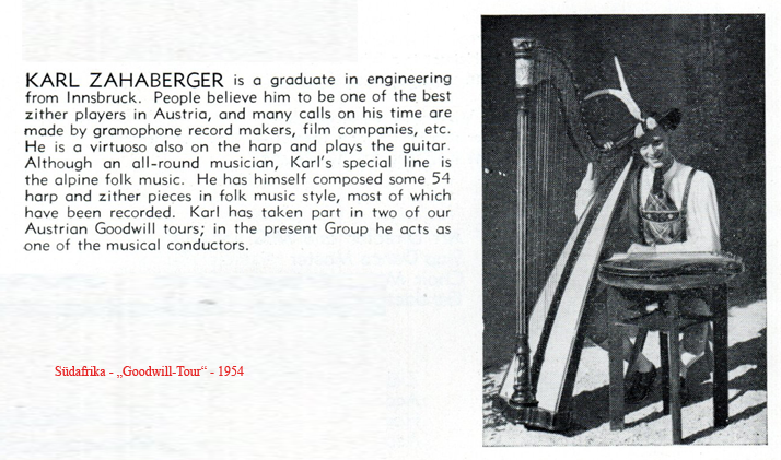 Karl Zahaberger wird 1921 in Mühlau (damals noch eigener Ort, seit 1938 Ortsteil von Innsbruck) geboren. Ab seinem siebten Lebensjahr erlernt er das Zitherspiel (ebenso wie Harfe, Gitarre und Mandoline) und wird schon sehr früh Mitglied des Innsbrucker Zithervereines. Er nimmt bereits vor dem Krieg Schallplatten auf, mit verschiedenen Gruppen, Duo’s und Trio’s (u. a. „D grüabigen Tiroler“, „Tiroler Instrumental-Trio“ oder im Duo mit Luis Luschnig – Gitarre). Auch soll er als (Aushilfs-) Harfinist bei den „fidelen Inntalern“ tätig gewesen sein?! Zu komponieren begann er nach dem zweiten Weltkrieg, zu dieser Zeit wirkte er bei zwei österreichischen Kulturfilmen mit. Von 1951 bis ~ 1957 war er Mitglied einer „Austrian Good Will Tour“ – Gruppe, die die ganze Welt bereiste. Unter anderen gehörte dieser Tour auch Vroni Stöckl an, die Innsbrucker Zitherspielern und Jodlerin des Franz Winkler-Quartettes. In Chicago blieb er wohl hängen – und zwar im „Golden Ox Restaurant“, wo er sieben Jahre lang als Zithersolist tätig ist.