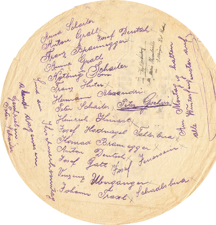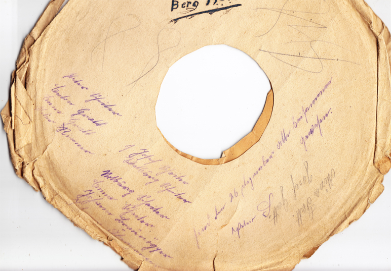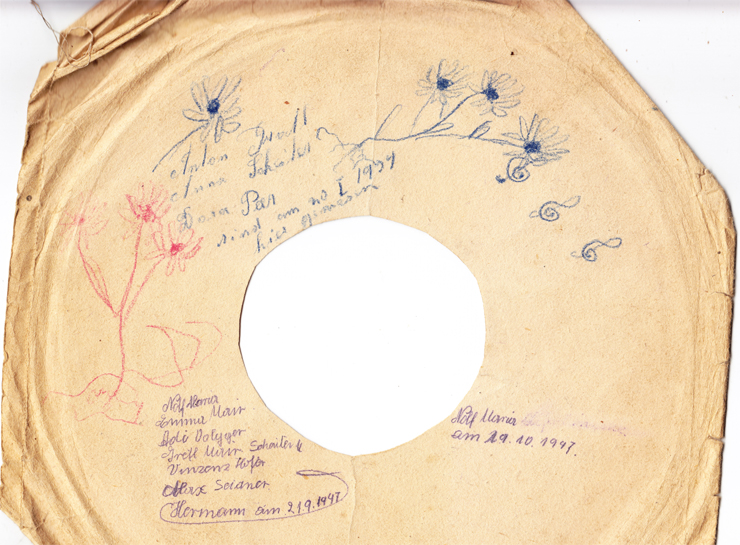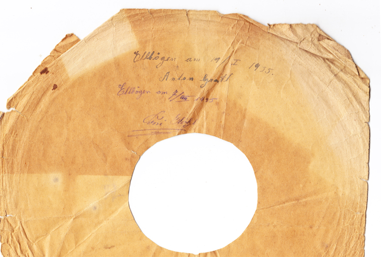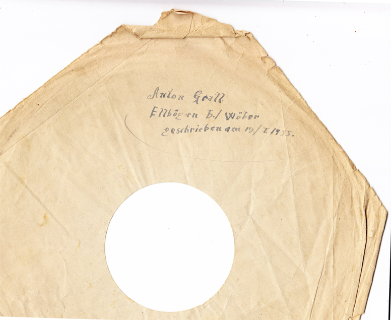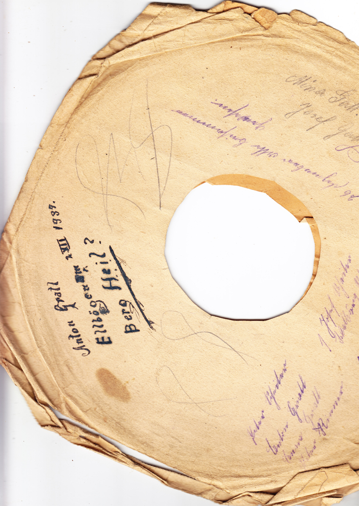 Ich bin an eine Schachtel mit Schellackplatten gekommen - ein Dachbodenfund! Auf den Hüllen hat sich ein Herr Anton Gratl aus Ellbögen mehrfach verewigt, indem er - sowohl seinen - als auch viele andere Namen darauf notierte. Vielleicht so eine Art Gästebuch zur Erinnerung an schöne Stunden mit Schellackplatten-Musik?!